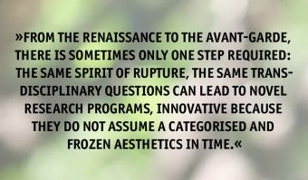 From the Renaissance to the avant-garde, there is sometimes only one step required: the same spirit of rupture, the same transdisciplinary questions can lead to novel research programs, innovative because they do not assume a categorised and frozen aesthetics in time.There are in expressionism and futurism, in dada and fluxus, eerily premonitory resonances with the trajectories of today. “Relaunching the Avant-Garde” is one such new educational format, questioning the typical modes of production of the historical avant-garde and the new avant-garde of the 1960s.